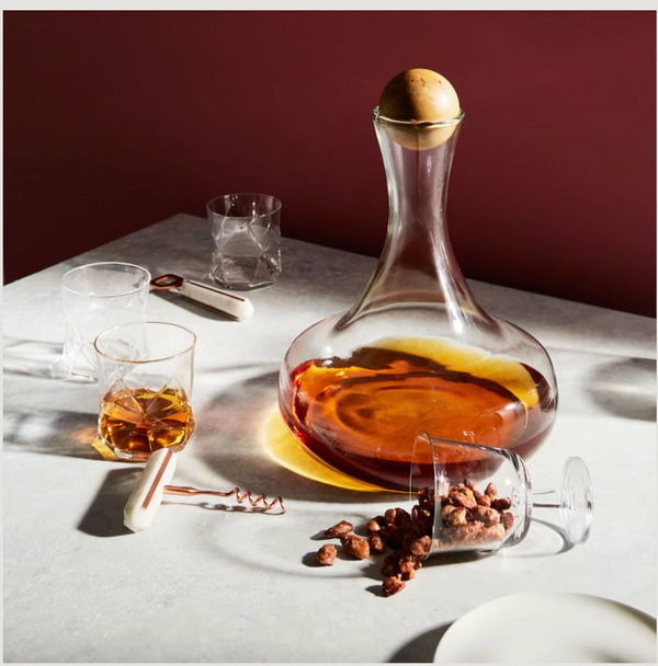 Simple, sculptural, and effortlessly elegant — this glass decanter is where form meets function. Topped with a warm wood stopper, it elevates any bar cart or dinner table with quiet, refined charm.