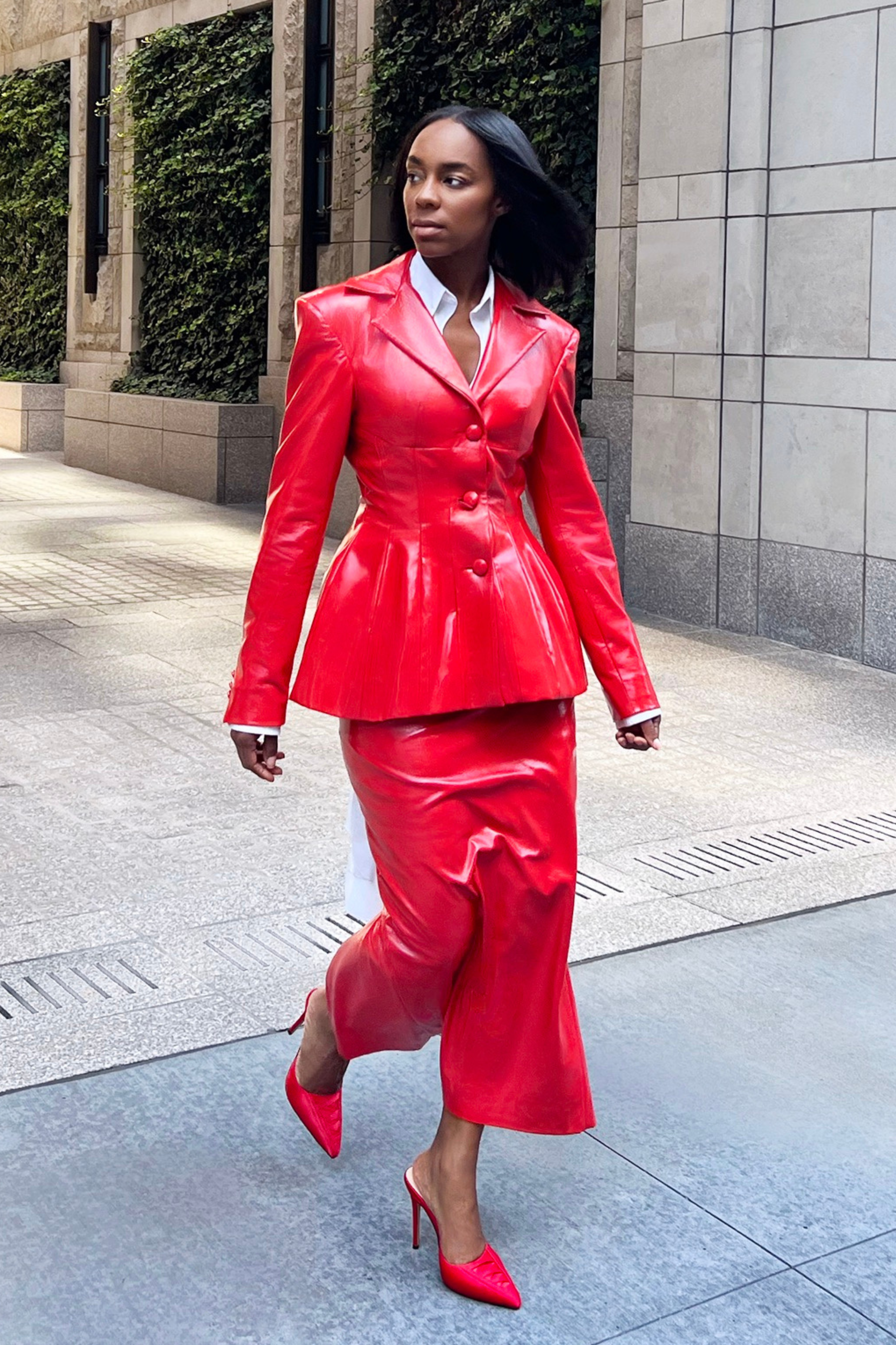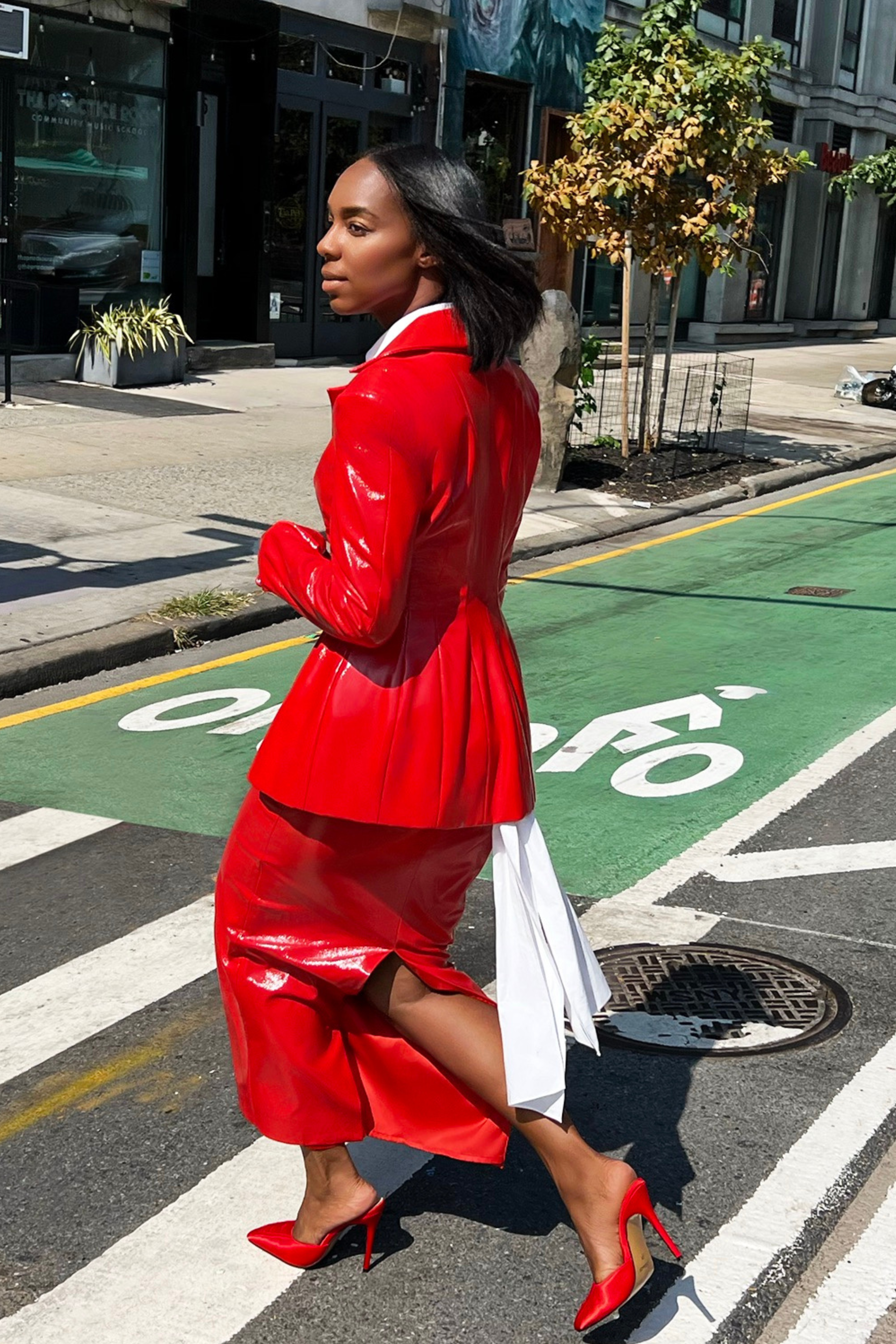 Unleash bold sophistication with the Risa Hourglass Patent Leather Blazer in Red. This statement-making piece seamlessly transitions from day to night, blending premium luxury and head-turning style.