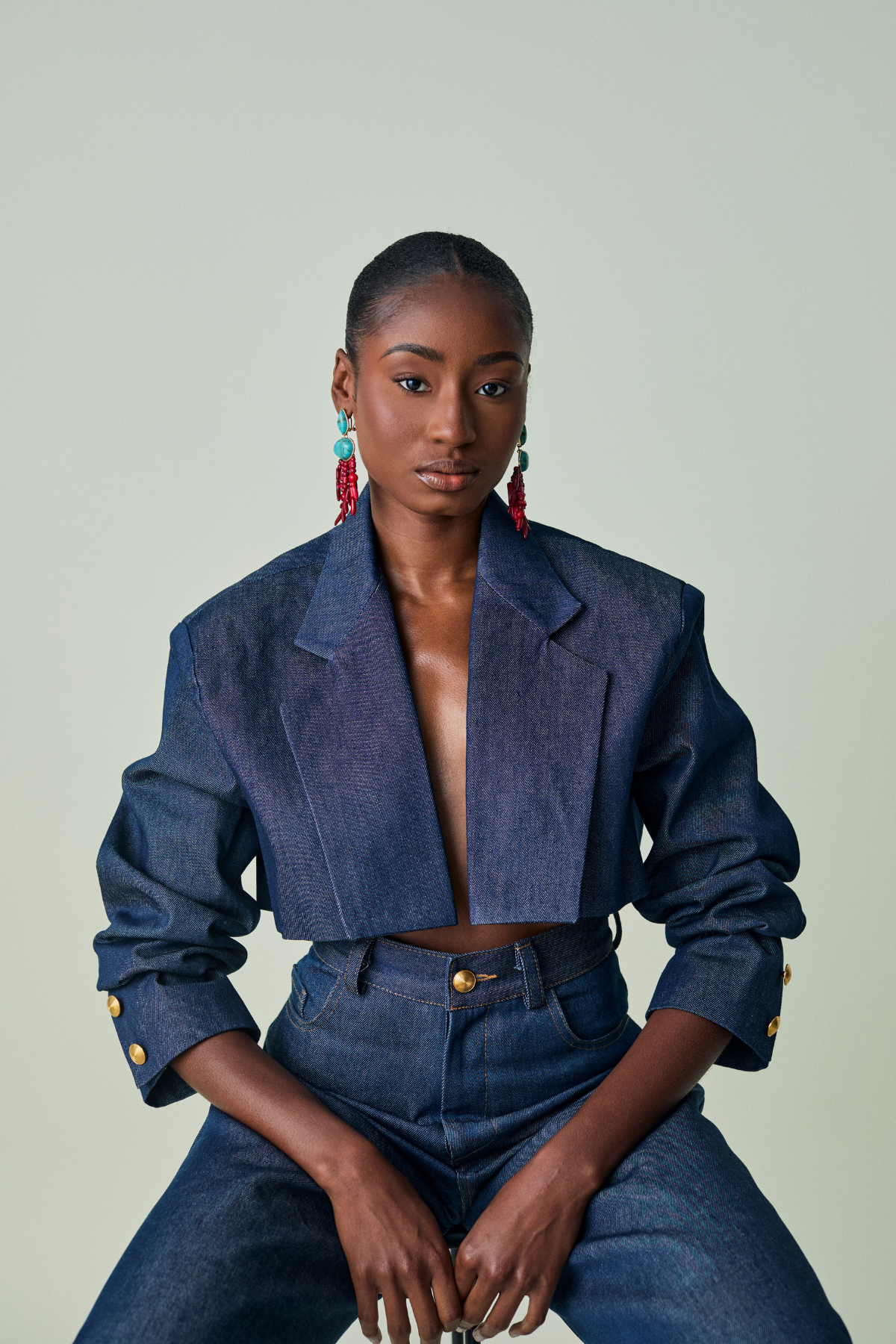 Menswear-inspired, redefined for her. Made in NYC from raw Cone denim and finished with a satin lining and gold sleeve button, this cropped blazer hits right at the waist — perfect for layering over anything. It replaces your standard denim jacket with polish. Dress it up for the office or down for the weekend. This is your new power layer.