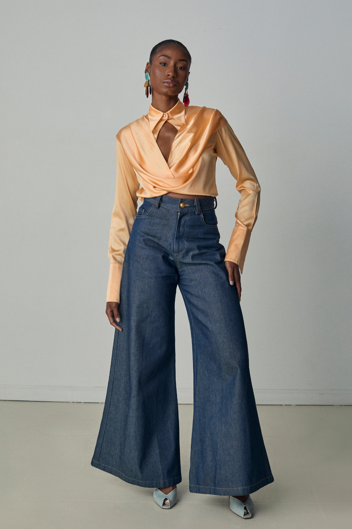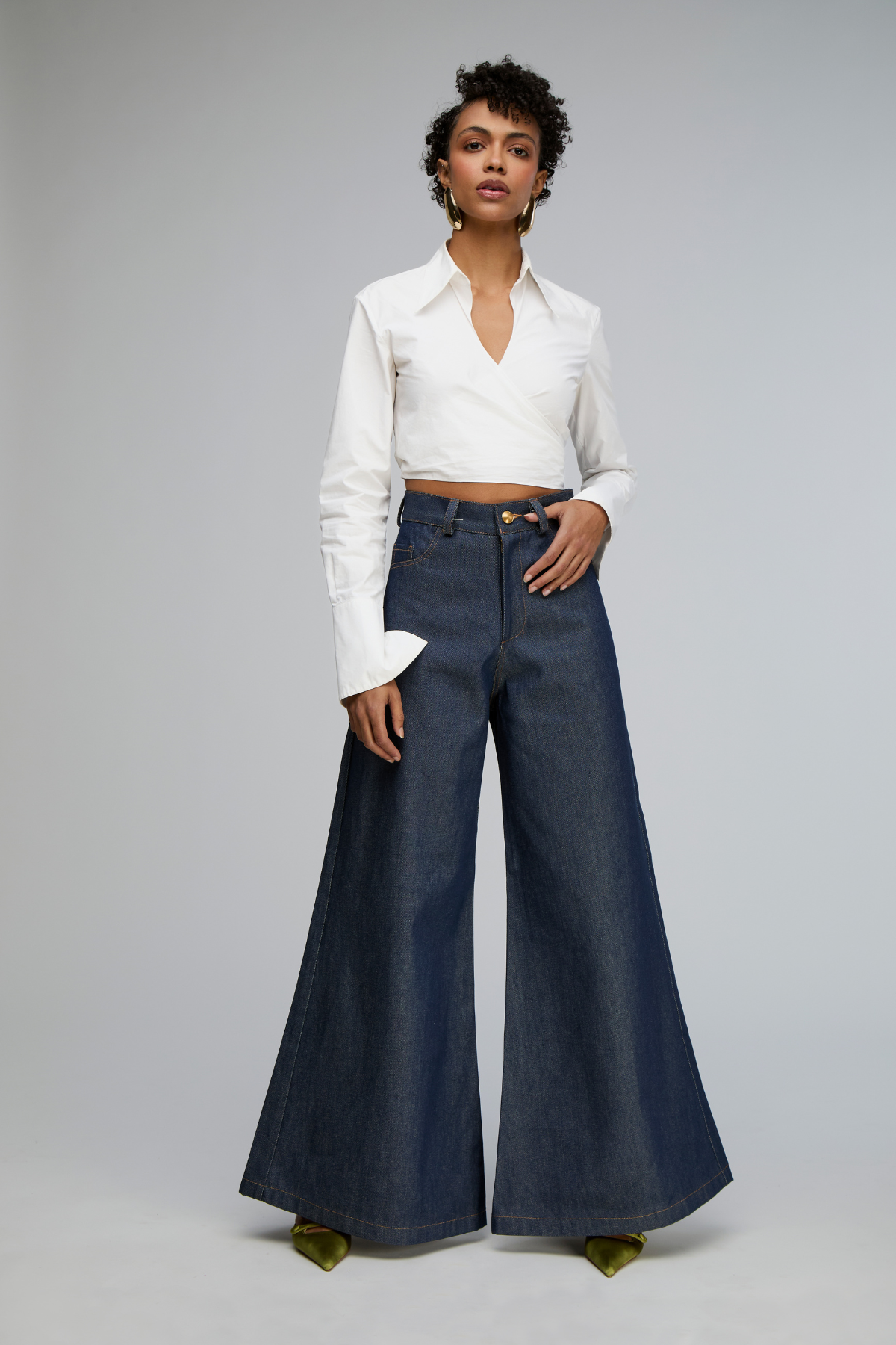 Our best-selling tailored jean, crafted from raw Cone denim in NYC. The high waist and dramatic wide-leg silhouette make it equally at home in the boardroom or at dinner. Runs slightly small — made to mold to your body with wear. Put together, powerful, and always intentional.